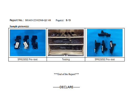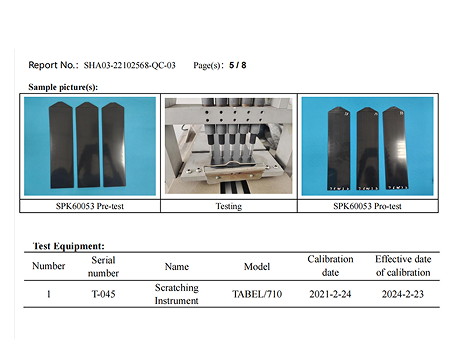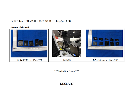 Incoming material inspection involves report verification and spot checks of product physical properties. During production, inspection fixtures are used for spot checks, typically one set out of every 100 sets.